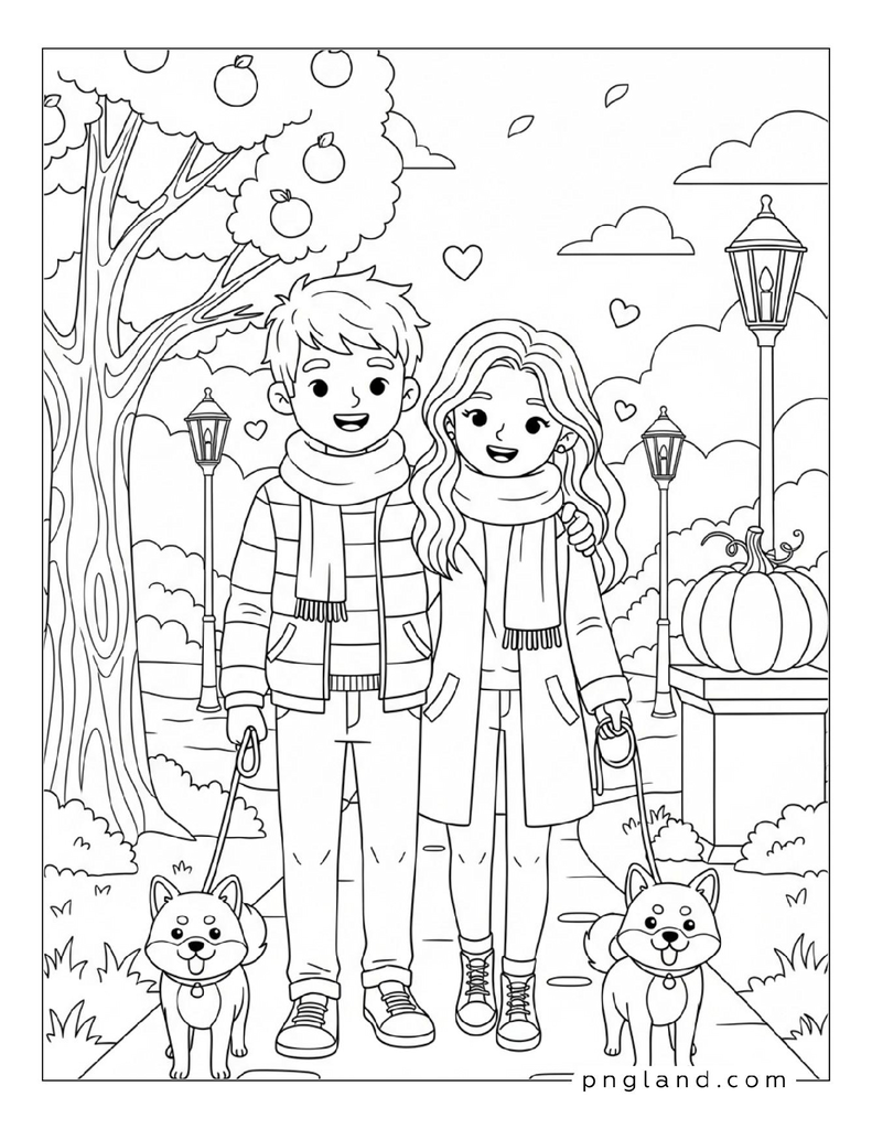 They are coloring sheets with warm love themes, like couples, hearts, home scenes, and cute animals, with a cozy vibe.