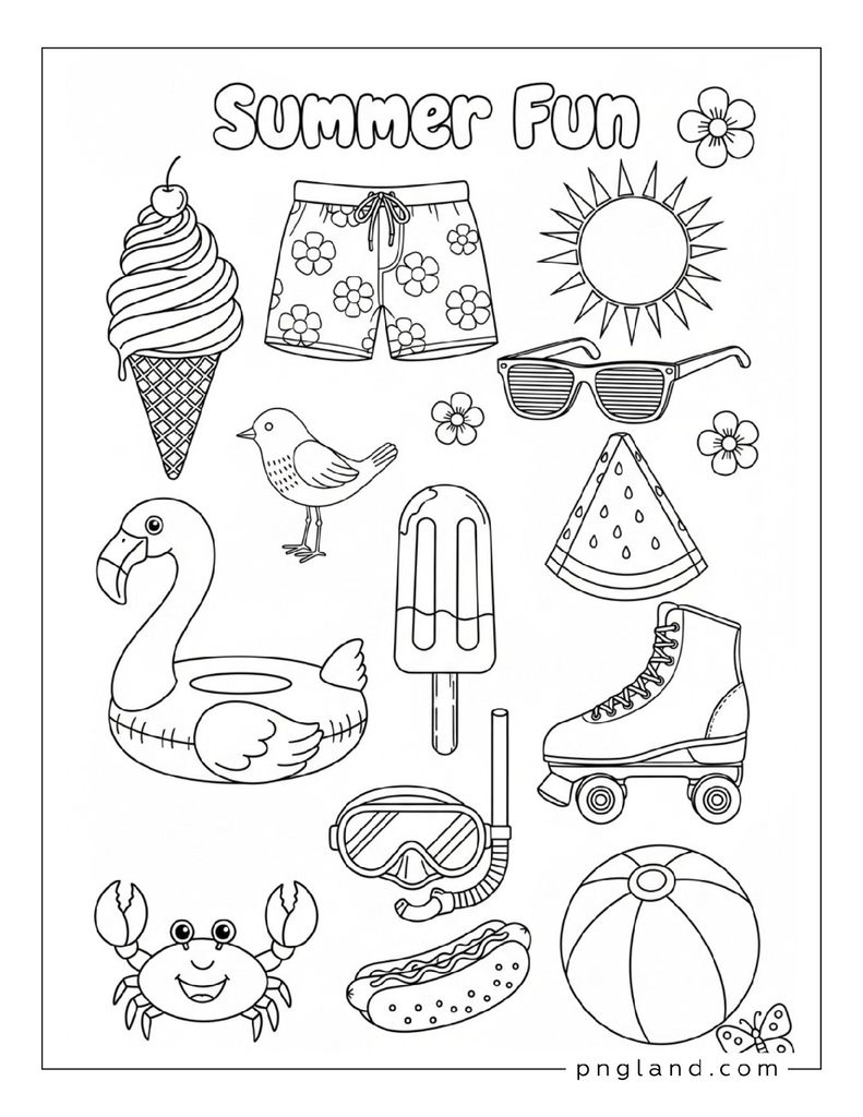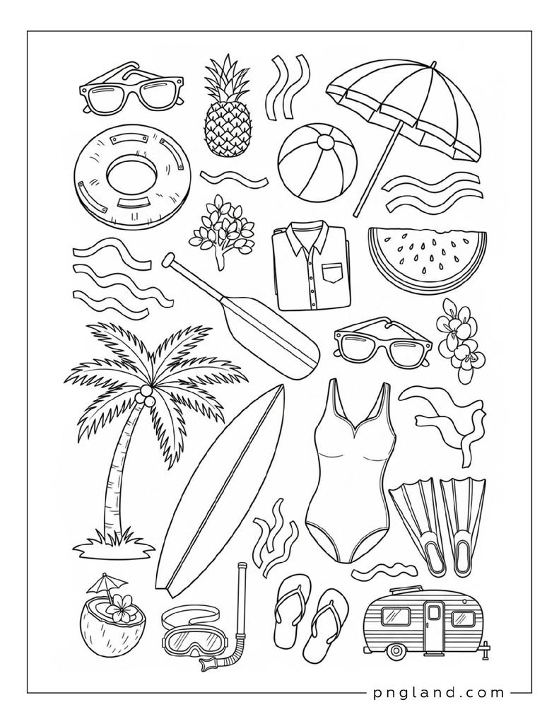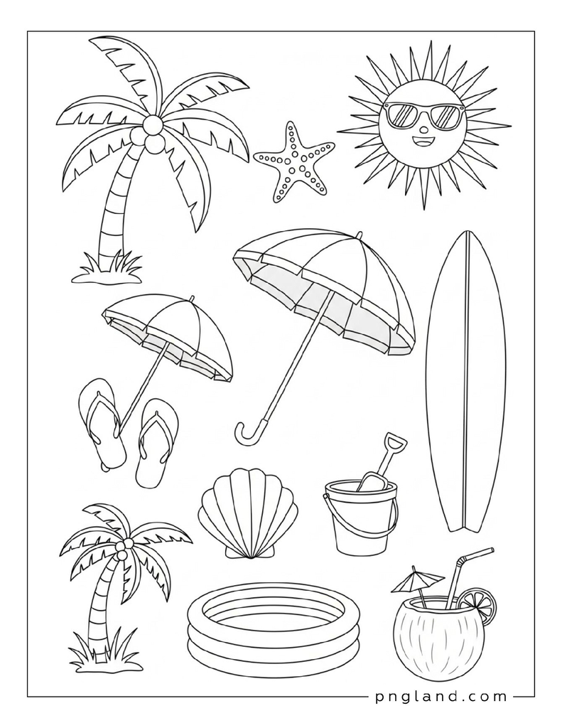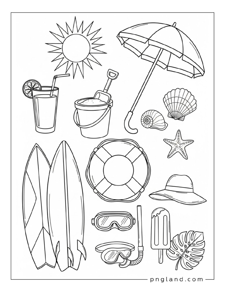 Here’s the big list: 73 ideas for summer coloring themes. Some are super simple. Some got more detail. You can pick what matches your mood (or your kid’s mood, which changes every 5 minutes, lol).