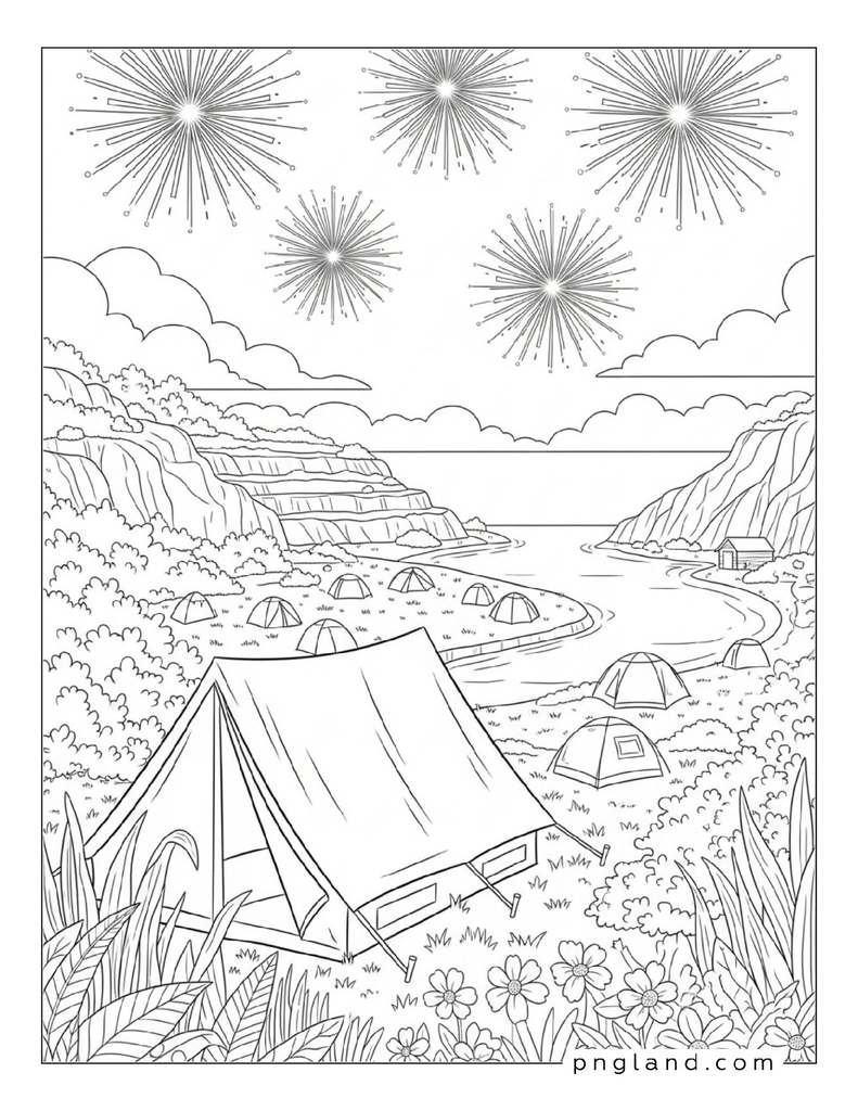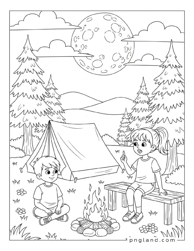 Use: camping tent, fireflies, moon, lake, canoe, trees.